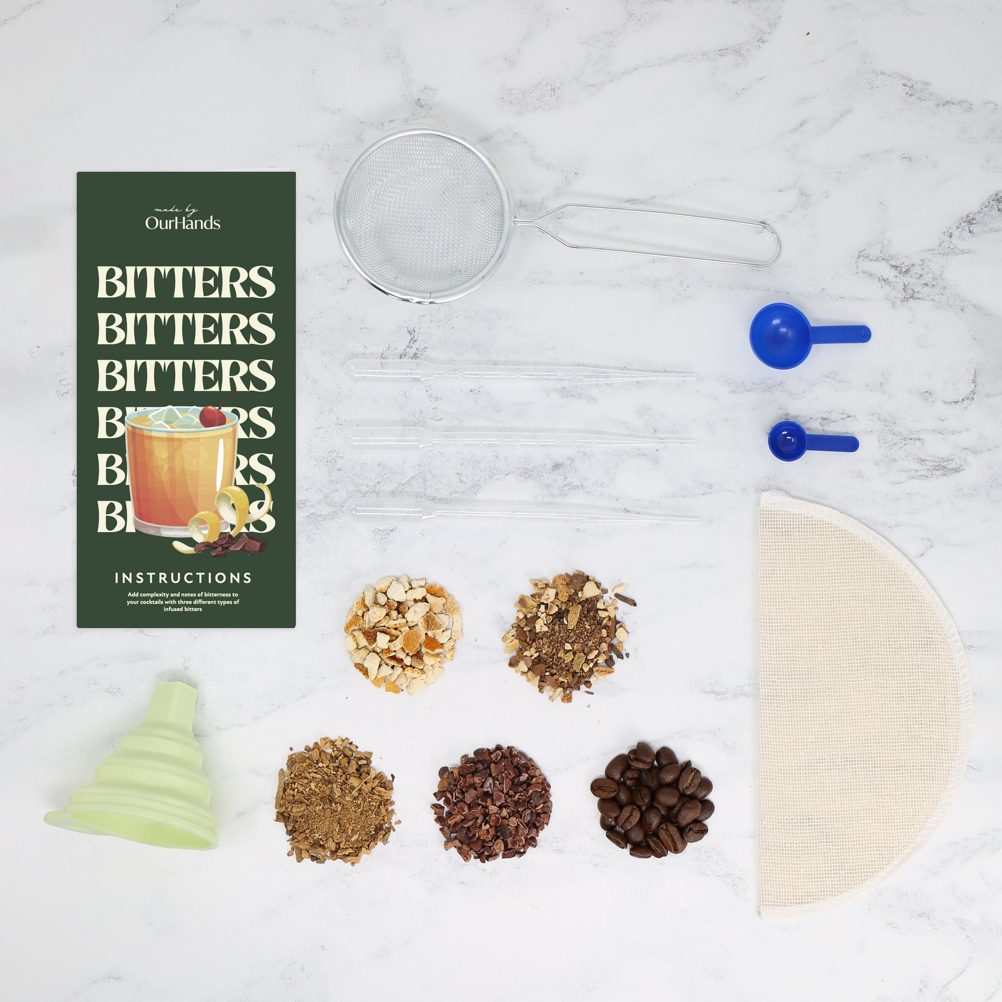 Gentian Root, Bitters Blend, Citrus Peel, Cocoa Nibs, Coffee Beans, Reusable Cotton Filter, Funnel, Metal Sieve, Pipettes, Scoops, Detailed Instruction Booklet