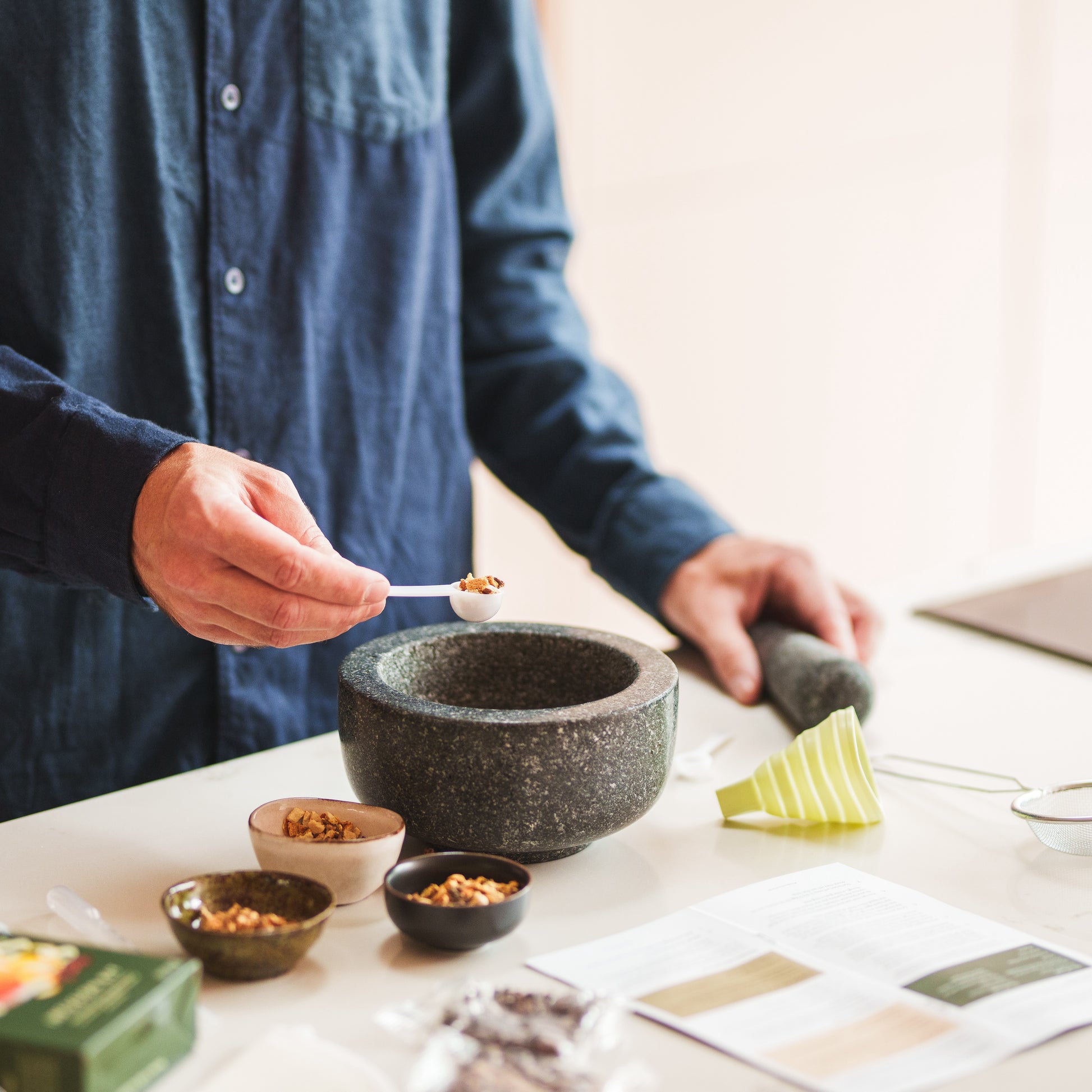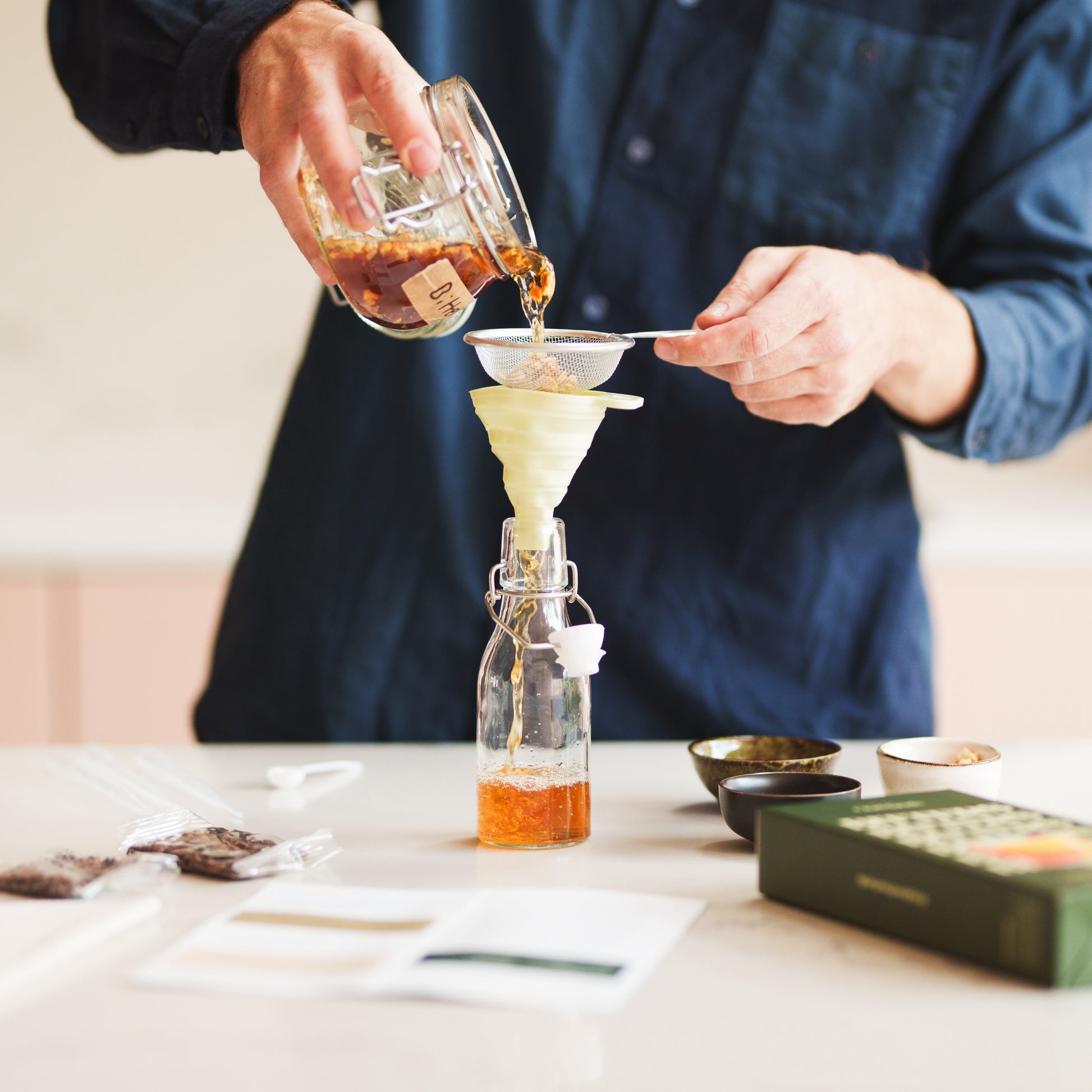 • infusing tools to make the infusing process even easier, like a metal sieve and reusable cotton filter for smooth infusions, measuring scoops for precision, and a funnel to ensure mess-free transfers