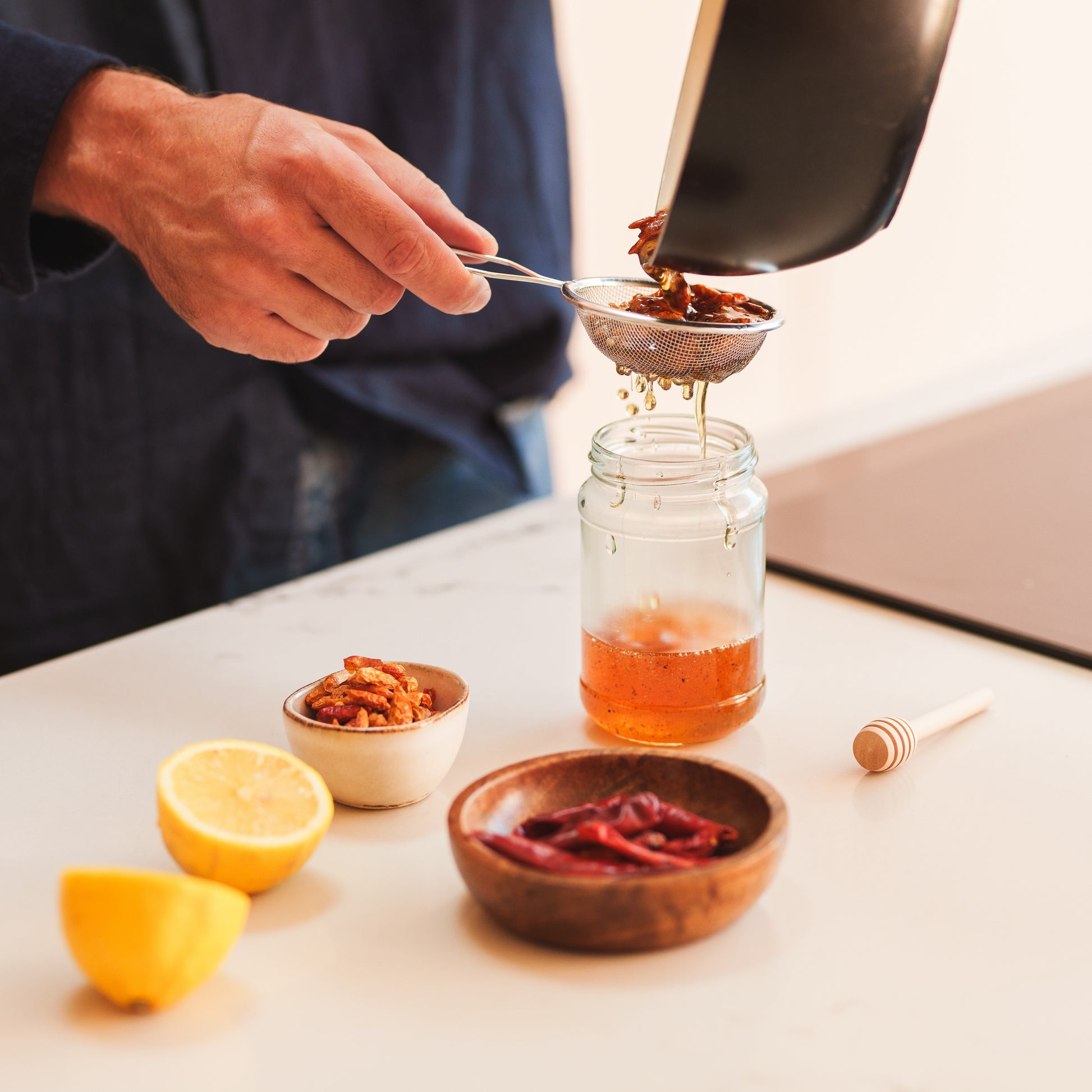 • Essential tools including two honey drizzlers for smooth pouring, a metal sieve to strain the honey for a clean finish, and gloves to safely handle the potent chillies without the mess