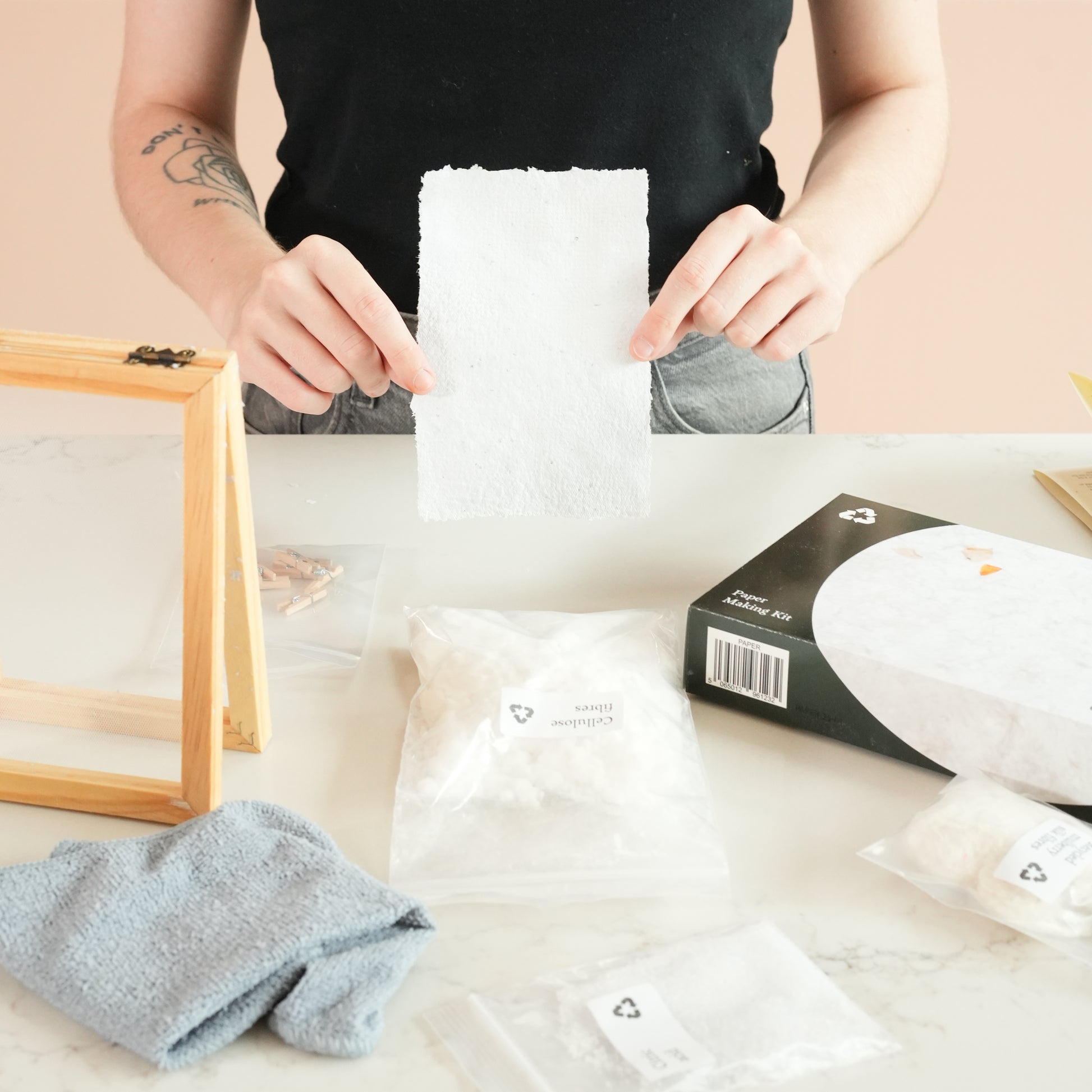 • Papermaking supplies such as citric acid to help break down your scrap paper, a microfiber cloth for removing moisture, and mini wooden pegs to hang your sheets to dry.