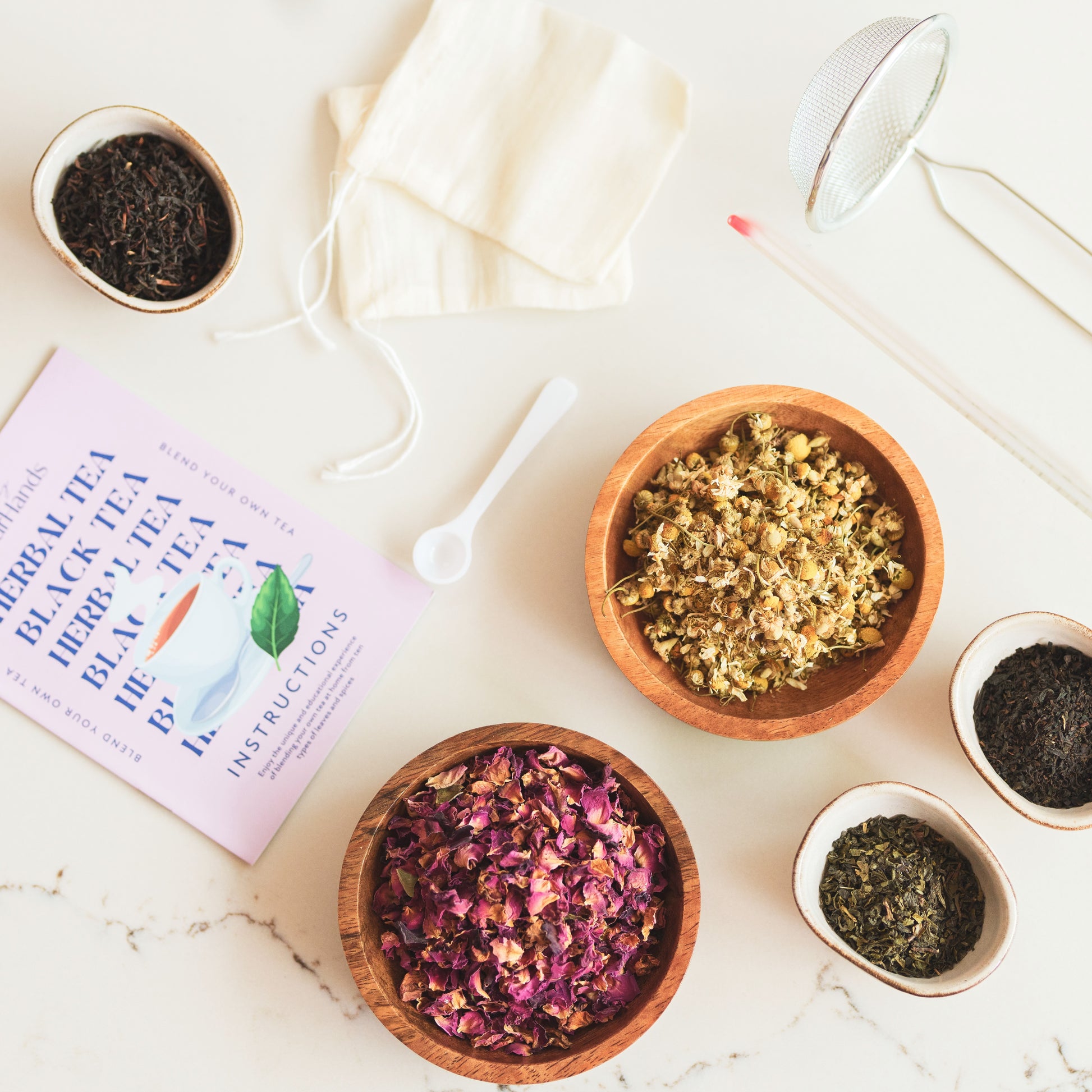 Perfect for both beginners and seasoned tea lovers, our kit contains everything you’ll need to start creating your custom tea blends from scratch: