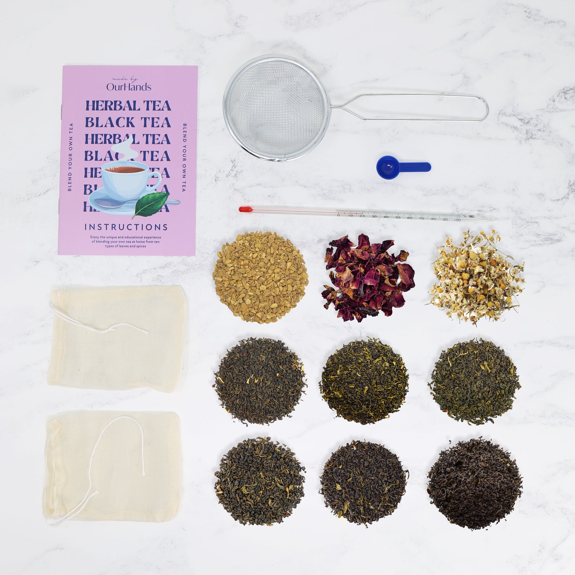 darjeeling tea, ceylon tea, green tea, earl grey, cardamom tea, jasmine tea, chamomile, rose petals, mixed spice blend, ginger, metal sieve, reusable cotton tea bags, measuring scoop, thermometer, detailed instruction booklet with recipes
