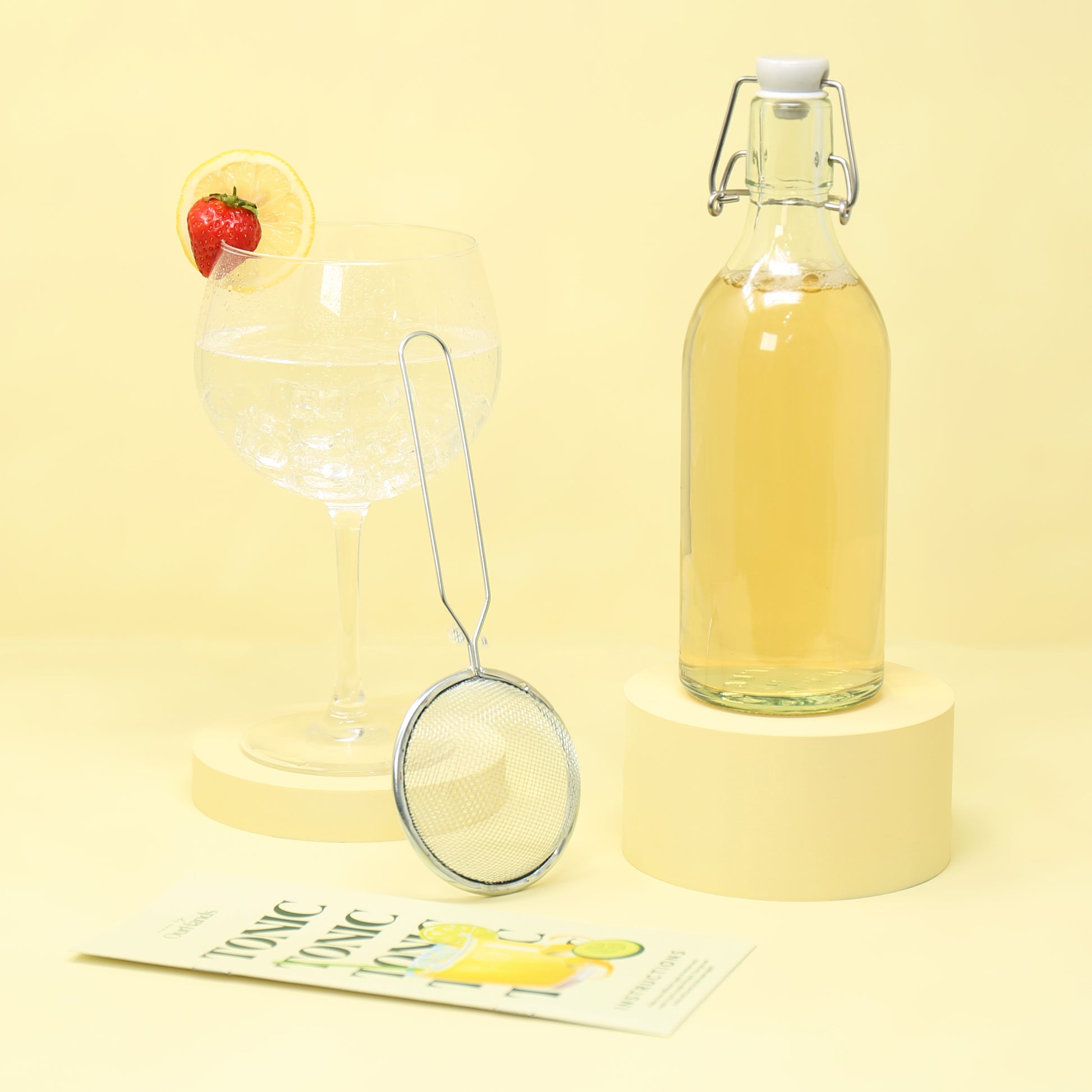 • infusing tools such as a metal sieve, a funnel, a reusable cotton filter and some scoops that will make infusing your tonic water easier than ever