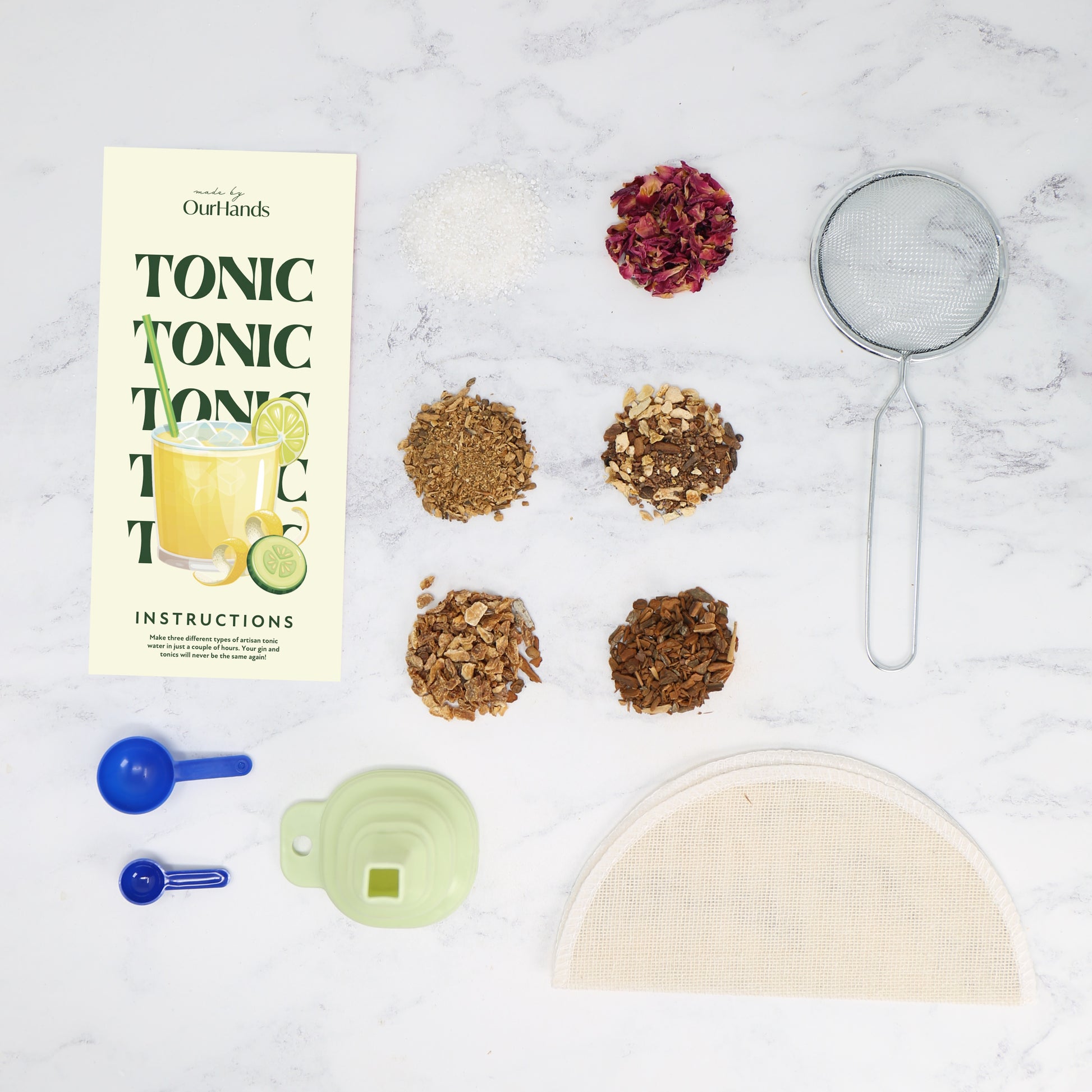 Tonic Base, Cinchona Bark, Gentian Root, Rose Petals, Orange Peel, Citric Acid, Metal Sieve, Funnel, Reusable Cotton Filter, Scoops, Detailed Instruction Booklet.